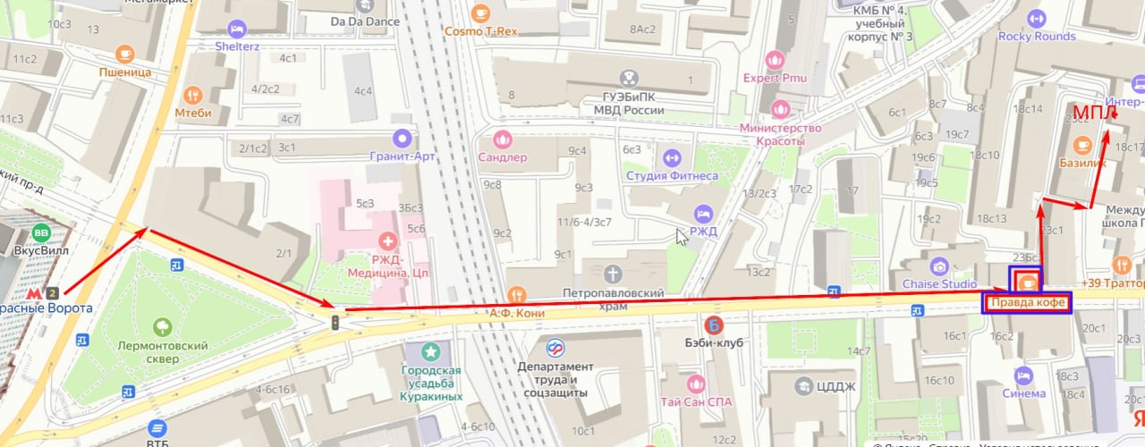 Как пройти: Метро «Красные ворота», проход между домами 21с1 и 23с1, после дома 23с1 направо в арку, дальше тоже прямо. Не доходя до железных ворот, увидите справа дверь - вам туда. Охранику сказать, что в МПЛ, он пропустит. Парковка городская☝️